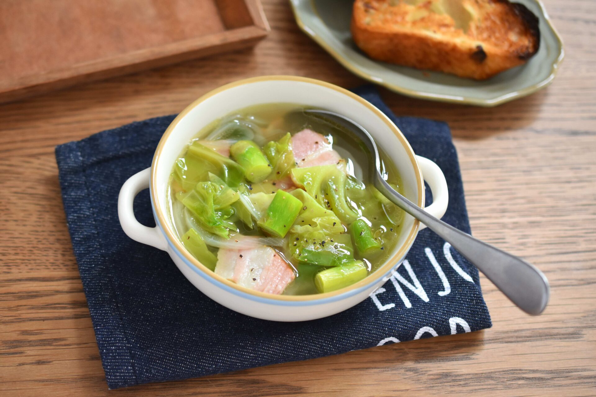 「スープなら、水のおいしさを存分に感じてもらえると思います。春キャベツの代わりに普通のキャベツ、新玉ねぎの代わりに通常の玉ねぎでもおいしく作れます。ベーコンがなければソーセージでも。キャベツとアスパラガスは食感を大切に、煮込みすぎないよう仕上げに加えるのがポイントです」